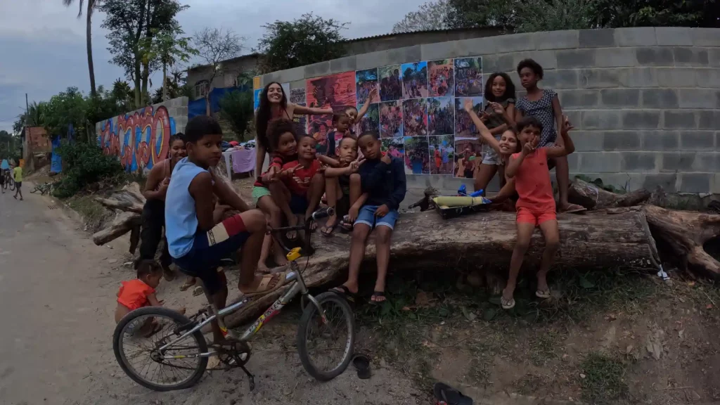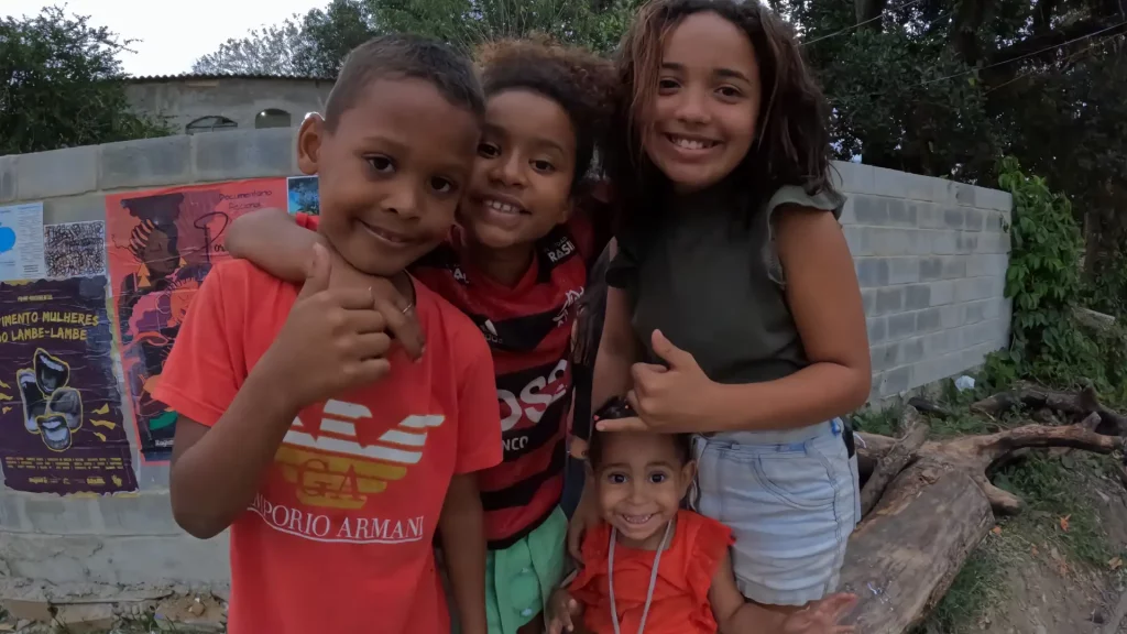 Crianças posam diante de cartazes culturais no bairro Cação, onde os coletivos atuam com cinema de resistência e ações comunitárias (Foto: arquivo pessoal)