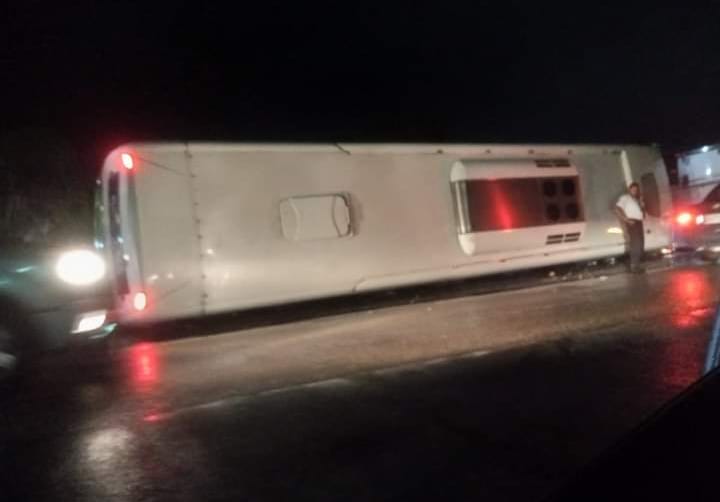 Itaguaí: ônibus da Eletronuclear bate em caminhão na Rio-Santos e tomba na pista